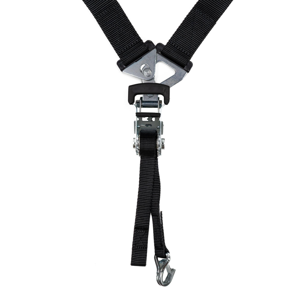 Deluxe Tie Down Bundle: motorcycle tie-down bundle secures handlebars with soft loop, ratcheting tie-downs, and rear tires with an innovative wheel strap as a leading tie-down system.