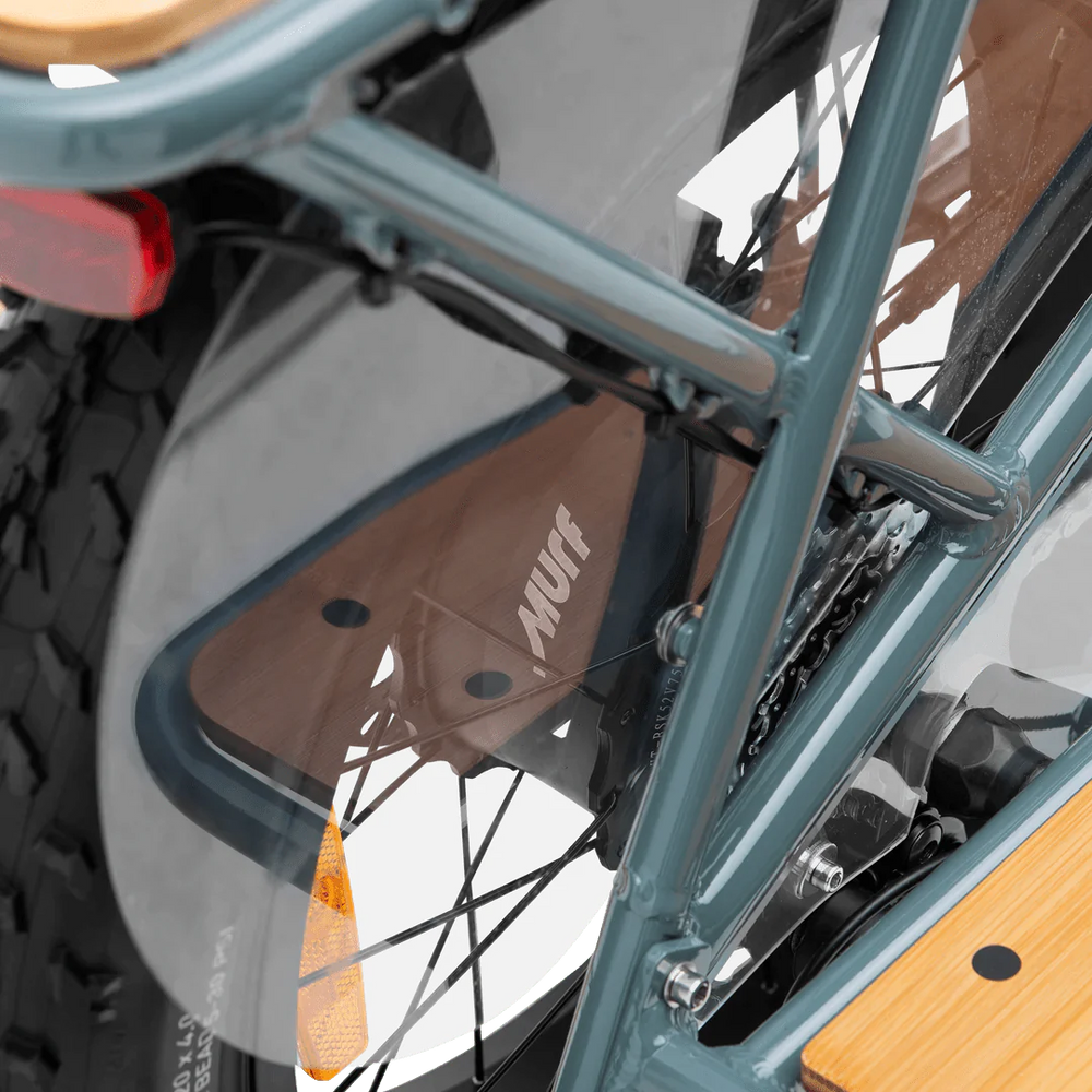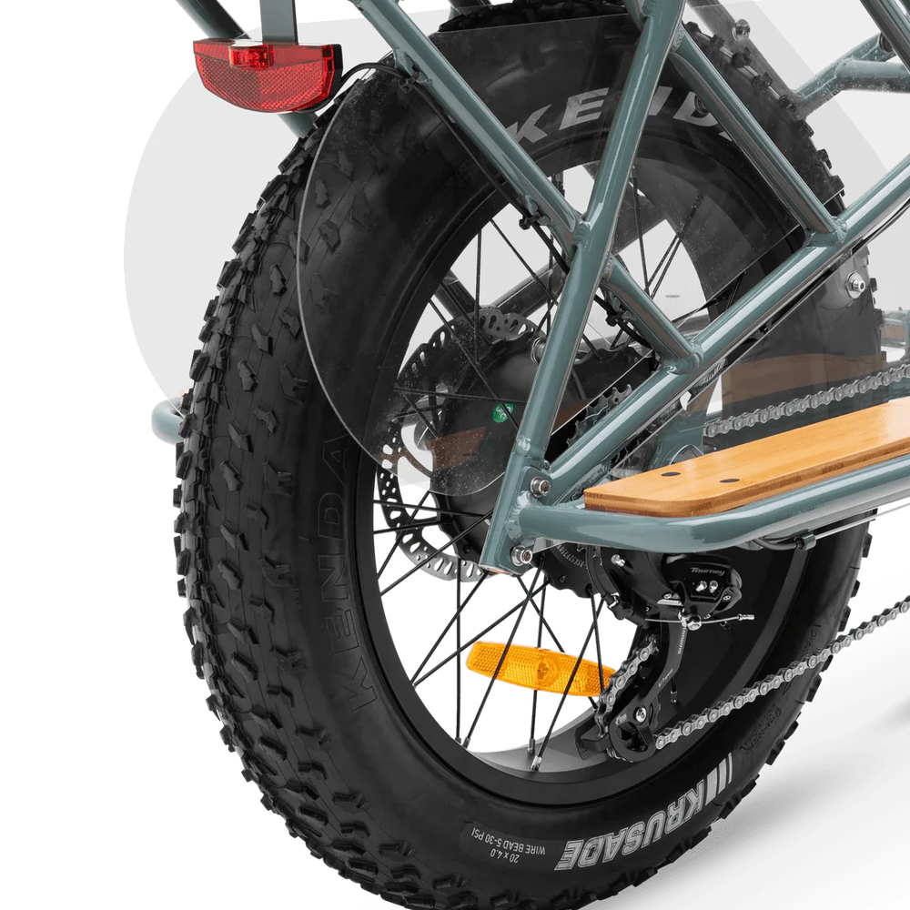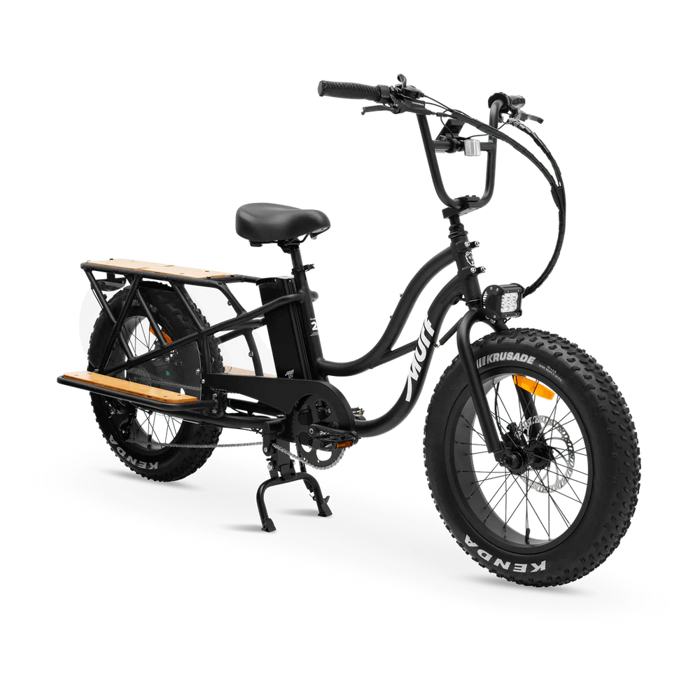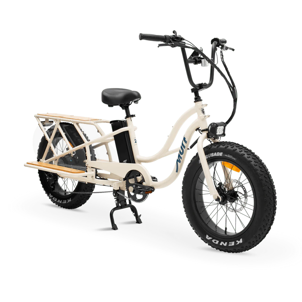 The MURF Higgs Cargo Step Over eBike is a Fat electric bike with a powerful 750 w motor and a long distance 52v 15 ah battery. With 20 inch Fat tires, 7 Speeds and Hydraulic brakes this Fat Tire Electric Cargo Beach Cruiser eBike is a Class 2, with a top speed up to up to 20 mph. An optimal distance of 40 – 50 miles and charge time of 4 – 6 hrs. This MURF Higgs Cargo Step Over electric bike is 75lbs with a maximum cargo weight of 330. The MURF Higgs Cargo comes in the following colors: Obsidian Black,Bone,Seabreeze Grey Gloss